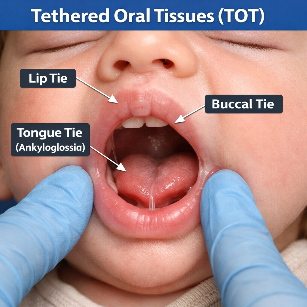 Tethered oral tissue (TOT) is an umbrella term used to describe conditions where the soft tissue connecting the tongue, lips, or cheeks to the floor or roof of the mouth is too short, thick, or tight — restricting normal movement and function.